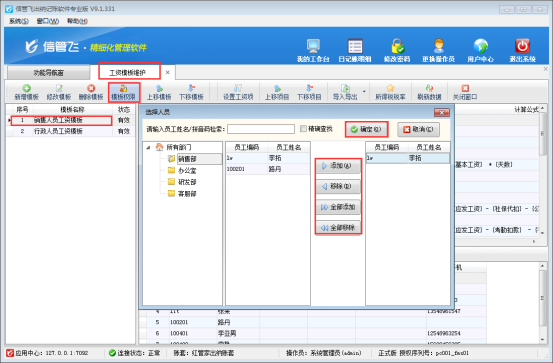 ????添加員工:工資模板設置好之后,可以添加需要按照此工資模板來計算工資的相應人員。