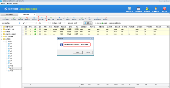 ????在功能導航窗點擊“綜合管理”—》“工資單管理”,打開工資單管理界面,在工資記錄列表中打鉤選擇要審核的工資記錄(工具欄點擊“批量操作”支持全選),然后點擊“審核工資記錄”,系統彈出提示信息“您確定要審核當前選擇的工資記錄嗎”,如下圖所示,點擊“確定”按鈕確定批量審核工資記錄。