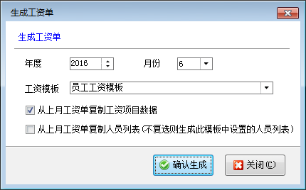 ????生成工資單:點擊“生成工資單”按鈕,可以彈出生成工資單窗口,如圖2所示,在此窗口選擇年度、月份及相應的工資模板,然后點擊“確認生成”按鈕即可生成相應的工資單,另外也可以打勾選擇“從上月工資單復制工資項目數據”及“從上月工資單復制人員列表(不復選則生成工資發放模板中設置的相應人員的工資)”選項,打勾復選,本月的工資項目數據則可以復制上月的工資項目數據,不復選則不會復制上月的工資項目數據。