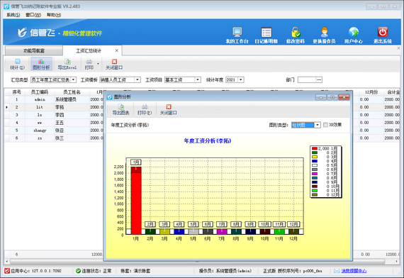 ????員工工資匯總統計表界面支持根據匯總類型、工資模板、工資項目、統計年度、月份等條件來進行統計所有員工的工資情況,包括員工姓名、基本工資、應發工資等數據。另外部門/員工年度工資匯總表也支持圖形分析功能,可以直觀查看每個員工在本年度各月份工資差異。在工具欄中也支持導出Excel文件、打印當前記錄等功能。