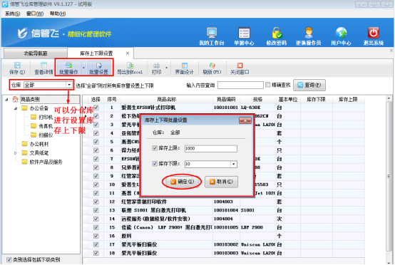 信管飛倉庫管理軟件、信管飛RMS支持庫存管理功能,為了更直觀的發(fā)現(xiàn)庫存數(shù)量,軟件中可以對商品庫存數(shù)量進(jìn)行庫存上下限設(shè)置,并可以在倉庫管理模塊中的“相關(guān)查詢統(tǒng)計”中進(jìn)行庫存預(yù)警查詢。以信管飛倉庫管理軟件為例,我們介紹一下如何設(shè)置庫存的上下限數(shù)量。 在功能導(dǎo)航窗選擇“倉庫管理”—》“庫存上下限設(shè)置”進(jìn)入庫存上下限設(shè)置界面,如圖1所示:圖1 以下為“庫存上下限設(shè)置”的功能操作說明: (1)可以選擇倉庫,默認(rèn)為“全部”即所有倉庫的預(yù)警上下限。也可以選擇一個具