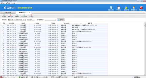 亞拓管理軟件、紅管家送貨單軟件、紅管家出納記賬軟件、紅管家倉庫管理軟件和紅管家票據(jù)打印軟件都可以實現(xiàn)多個操作員登錄使用軟件的功能,操作員登錄軟件后,系統(tǒng)會生成操作日志,在系統(tǒng)操作日志管理中可以查看每個操作員的登錄退出記錄以及重要操作的記錄。系統(tǒng)管理員可刪除操作日志,支持批量操作。本文以亞拓管理軟件專業(yè)版為例詳細介紹一下軟件中查看系統(tǒng)操作日志的使用方法。 在功能導(dǎo)航窗點“系統(tǒng)管理”—》“系統(tǒng)操作日志”即可進入“系統(tǒng)操作日志”界面,如圖1所示。圖1 系統(tǒng)操作日志界面 如圖1所示,可以根據(jù)操