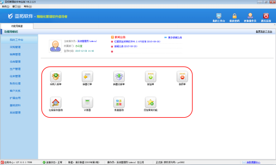 亞拓軟件開發(fā)的亞拓管理軟件、亞拓倉庫管理軟件、紅管家票據(jù)打印軟件等都包含我的工作臺功能,我的工作臺中可以查看當(dāng)前操作員信息、最新的通知公告、業(yè)務(wù)提醒信息,并且可以添加一些常用的功能模塊。下面我們以亞拓管理軟件專業(yè)版為例詳細(xì)介紹下我的工作臺功能是如何使用的。 首先登陸亞拓管理軟件,點(diǎn)擊“功能導(dǎo)航窗”—“我的工作臺”,可以打開我的工作臺頁面,下圖為我的工作臺界面。圖一 我的工作臺界面 在我的工作臺界面中,首先可以查看當(dāng)前操作員信息及最新公告信息,另外點(diǎn)擊“添加常用功能”按鈕可以添