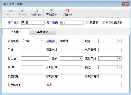 亞拓管理軟件、紅管家倉庫管理軟件、紅管家票據(jù)打印軟件、紅管家財(cái)務(wù)出納記賬系統(tǒng)、紅管家送貨單軟件都支持對公司員工信息的管理。員工信息管理實(shí)現(xiàn)員工資料的維護(hù),可對員工顯示順序進(jìn)行設(shè)置,軟件都支持通過Excel文件導(dǎo)入員工資料。下面我們以亞拓管理軟件為例介紹下在軟件中如何管理員工信息。 登錄軟件,在功能導(dǎo)航窗中點(diǎn)擊“基礎(chǔ)資料”—》“員工信息”,即可進(jìn)入“員工信息”維護(hù)功能,其界面如下圖所示: 新增員工:點(diǎn)“新增”按鈕可以增加員工信息。 修改員工信息:點(diǎn)“修