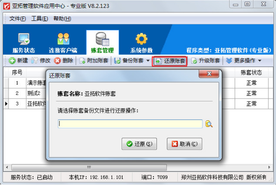 亞拓管理軟件、亞拓倉庫管理軟件中都含有賬套管理功能,賬套管理實現賬套數據庫的集中管理,包括新建賬套、修改賬套屬性、刪除賬套、附加賬套、備份賬套、還原賬套和升級賬套等功能。下面我們以亞拓管理軟件為例來演示一下賬套管理中各個功能具體的操作方法。 打開亞拓管理軟件應用中心(桌面右下角紅色的圖標)—》“賬套管理”即可進入賬套管理界面,如下圖1所示:圖11、新建:新建賬套時,可以設置賬套名稱、文件名以及賬套的存放路徑。賬套文件名不支持漢字,請輸入字母或數字,并盡量不要使用特殊符號。賬套存放目錄我們建議使用默認的目錄即程序所在目錄下