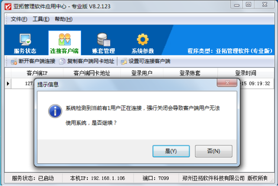亞拓軟件采用新架構技術開發的進銷存管理軟件和庫存管理軟件:亞拓管理軟件(星光版、標準版、專業版)、亞拓倉庫管理軟件(標準版、專業版)都支持主機(插有加密鎖的機器即為主機)在應用中心中對可連接的客戶端進行管理,可以管理已連接到主機(插有加密鎖的機器即為主機)的客戶端電腦信息,包括客戶端IP、客戶端網卡地址、登錄操作員、登錄賬套以及登錄時間,讓系統管理員很方便的對可連接應用中心的客戶端進行管理。下面我們以亞拓管理軟件專業版為例來詳細介紹下進銷存管理軟件中如何在應用中心對可連接客戶端進行管理。 在桌面上雙擊“亞拓管理軟件應用中