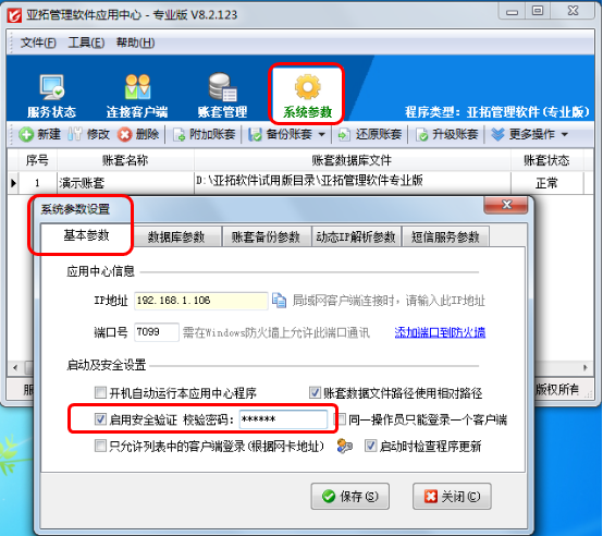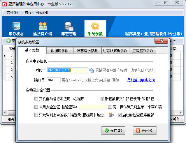 系統參數設置主要包括基本參數、數據庫參數、賬套備份參數、動態IP解析參數、短信服務參數等,亞拓管理軟件、亞拓倉庫管理軟件的應用中心都包含系統參數設置功能,下面我們以亞拓管理軟件為例來介紹一下系統參數設置的相應功能。 打開亞拓管理軟件應用中心(桌面右下角紅色的圖標)—》“系統參數”即可進入系統參數設置界面,如下圖1所示:圖11、基本參數圖2端口號:默認為7099,一般不需要修改。點“添加端口到防火墻”可以在防火墻中添加規則允許相應的端口通訊。如果防火墻攔截導致無法設置成功,需要手工在控制面板中的Windows防火墻中添加相