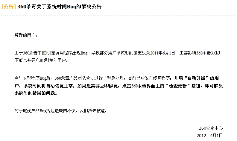 今天部分用戶反饋,新增憑證的時(shí)候,憑證的默認(rèn)日期變?yōu)椤?011-06-01”,導(dǎo)致用戶保存的時(shí)候提示憑證日期不在當(dāng)前賬期,從而無(wú)法保存憑證。 解決這個(gè)問(wèn)題可以通過(guò)調(diào)整系統(tǒng)日期實(shí)現(xiàn),在桌面右下角點(diǎn)擊系統(tǒng)時(shí)間,會(huì)彈出“日期和時(shí)間 屬性”窗口,可以直接調(diào)整系統(tǒng)日期。如下圖所示: 經(jīng)過(guò)我司技術(shù)人員密切跟蹤,發(fā)現(xiàn)此問(wèn)題僅出現(xiàn)在部分安裝360殺毒軟件的機(jī)器上,初步懷疑是360查殺病毒時(shí)進(jìn)行系統(tǒng)時(shí)間鎖定保護(hù)導(dǎo)致的異常。 PS:360已發(fā)布公告,確認(rèn)系統(tǒng)時(shí)間篡改是由于360殺毒軟件的BD殺毒引擎異常導(dǎo)