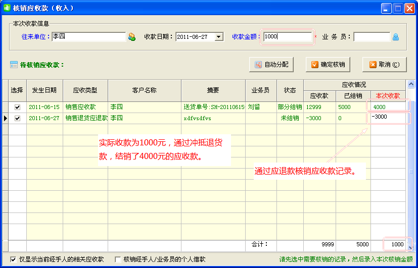 我公司的出納記賬軟件、進(jìn)銷存軟件、送貨單軟件等都有應(yīng)收款應(yīng)付款往來帳管理功能,支持增加預(yù)付款、應(yīng)退款,并可以將周期性的應(yīng)收應(yīng)付款進(jìn)行批量增加(比如房租、車貸、固定收益等),在核銷往來帳時(shí),預(yù)付款、應(yīng)退款可以沖抵應(yīng)收應(yīng)付。核銷記錄可以轉(zhuǎn)記日記賬憑證。 有客戶在核銷往來帳時(shí),有時(shí)會(huì)出現(xiàn)誤核銷的情況,這個(gè)時(shí)候想刪除核銷記錄,或者想刪除往來帳(應(yīng)收款/應(yīng)付款記錄),這個(gè)時(shí)候系統(tǒng)會(huì)提示“已經(jīng)結(jié)銷的應(yīng)收款/應(yīng)付款記錄無法刪除”。 這個(gè)時(shí)候,你可以在應(yīng)收款管理或應(yīng)付款管理中,選擇相應(yīng)的記錄,點(diǎn)“修改應(yīng)收款”或者“修改應(yīng)付款”按鈕,在彈