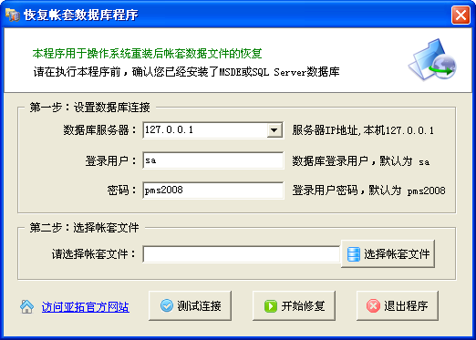 本程序可以在您重新安裝操作系統后,恢復帳套數據庫,支持新陽天進銷存系統、好好用財務出納記賬系統、好好用日記賬系統等全系列系統。如果您的機器無法啟動,有沒有備份的帳套數據文件(后綴名為.pmd)或者很久沒有備份過,可以通過本工具將帳套數據文件(后綴名為.mdf)直接恢復。此程序為最新版本 2001.05.26下載地址: http://www.mcnet.net.cn/download/DBTools.exe程序界面: