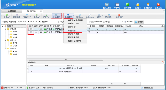 此文章相關(guān)演示視頻:信管飛RMS軟件會計(jì)憑證如何批量取消記賬演示視頻 信管飛RMS專業(yè)版包含財(cái)務(wù)處理功能可用來登記會計(jì)憑證,有用戶在記賬之后需要修改憑證,已過賬狀態(tài)下無法進(jìn)行修改,需要先把憑證取消記賬后才能進(jìn)行反審修改,如果需要修改的已過賬憑證過多,一個一個取消記賬過于麻煩,軟件內(nèi)支持在會計(jì)憑證列表批量取消記賬,本篇文章介紹下如何操作。 在軟件內(nèi)點(diǎn)擊“賬務(wù)處理”—》“會計(jì)憑證”,可打開會計(jì)憑證列表界面