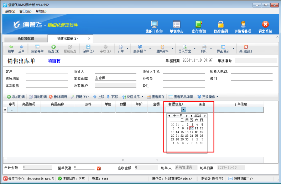 信管飛系列軟件開單界面均支持自定義設(shè)計(jì)顯示數(shù)據(jù)項(xiàng)。軟件除了默認(rèn)顯示的數(shù)據(jù)項(xiàng)外,可以額外添加擴(kuò)展數(shù)據(jù)項(xiàng),擴(kuò)展信息數(shù)據(jù)項(xiàng)支持設(shè)置取值方式,如果擴(kuò)展字段內(nèi)容需要輸入日期,可以設(shè)置為日期輸入,可開單直接選擇日期輸入,本文以“信管飛RMS軟件”為例,示范下如何設(shè)置擴(kuò)展信息可輸入日期? 演示視頻觀看鏈接:如何設(shè)置擴(kuò)展信息可輸入日期? 功能導(dǎo)航窗選擇“銷售管理”,打開銷售出庫單界面,點(diǎn)擊工具欄“界面設(shè)計(jì)”,界面設(shè)計(jì)單據(jù)明細(xì)中勾選顯示“擴(kuò)展信息1”,取值方式選擇“日
