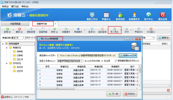 信管飛RMS軟件是集采購管理、銷售管理、往來管理等一體的進銷存軟件,軟件支持直接進行開單,也支持通過Excel文件批量導入單據。本文示范下如何通過Excel批量導入單據。 在功能導航窗點擊“系統(tǒng)管理”—》“系統(tǒng)參數配置”,選擇“業(yè)務參數”,勾選參數“Excel導入銷售單(按單據編號導入不同單據)”,保存設置,如下圖所示: 軟件導入Excel格式需要一定的樣式,可以在銷售管理—右側查詢統(tǒng)計下打開“銷售明細查詢”表,導出Excel文件作為模板,把需要導入