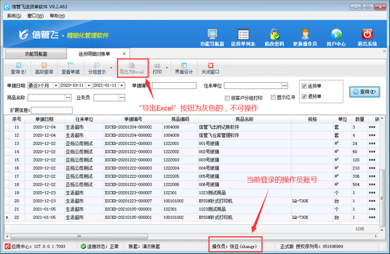信管飛送貨單軟件為集訂單管理、送貨管理、收款結算等功能并支持送貨明細對賬及業(yè)務綜合對賬的送貨單打印軟件。軟件根據錄入的每張訂單及送貨單等數據,可以自動生成統(tǒng)計報表,完成企業(yè)銷售統(tǒng)計查詢和與客戶送貨明細對賬的目的,如下圖所示。如果不希望操作員賬號登錄后導出送貨明細對賬單,如何設置呢?本篇文章介紹一下具體操作步驟。 演示視頻觀看鏈接:送貨單軟件如何設置操作員不可導出送貨明細對賬單演示視頻 登錄軟件,在功能導航窗點擊“系統(tǒng)管理”—》“操作員及授權”,進入“操作員管理及授權”界面,選擇操作員“