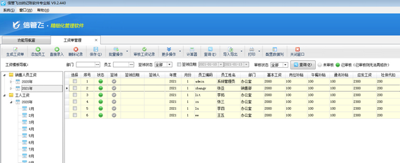 信管飛出納記賬軟件專業(yè)版包括工資管理功能,支持自定義工資模板,可根據設置的工資模板快速生成工資單,支持從上月工資單復制工資項目數據,工資項目數據錄入完成核對無誤后審核生效,審核后不再支持直接修改。如果工資記錄較多,逐條審核工資記錄會比較耗時,軟件支持批量審核工資記錄,可節(jié)省時間提高工作效率。本篇文章介紹一下出納記賬軟件中如何批量審核工資記錄? 在功能導航窗點擊“綜合管理”—》“工資單管理”,打開工資單管理界面,在工資記錄列表中打鉤選擇要審核的工資記錄(工具欄點擊“批量操作”支持全選),然后點擊“審核工資記錄”,系統(tǒng)彈出提