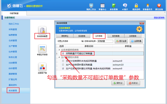 在企業的日常運營中,進銷存管理至關重要,而能否快速準確地掌握商品庫存數量,更是影響著采購、銷售等環節的決策效率。信管飛旗下的進銷存管理軟件,功能強大且操作便捷,下面就為大家詳細介紹如何設置在選擇商品時查看庫存可用數量。     第一步:進入業務參數設置頁面     在功能導航窗中,仔細查找并“系統管理”選項,點擊“系統參數配置”后,會彈出一個菜單,在菜單中選擇“業務參數”,此時就會進入業務參數設置頁面。這個頁面包含了軟件中與業務相關的各種參數設置。 &nb