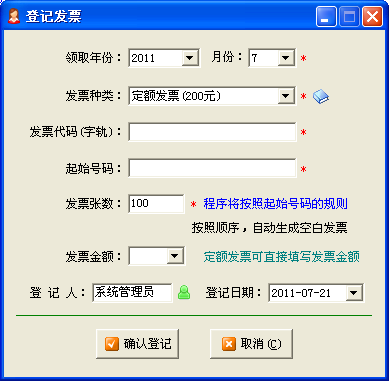 銷項(xiàng)發(fā)票目前主要分為定額發(fā)票、增值稅發(fā)票、一般機(jī)打發(fā)票三種,公司會計人員在稅局購領(lǐng)后,需要在第一時間內(nèi),在《紅管家財務(wù)出納記賬系統(tǒng)》中進(jìn)行登記。主要登記信息包括: