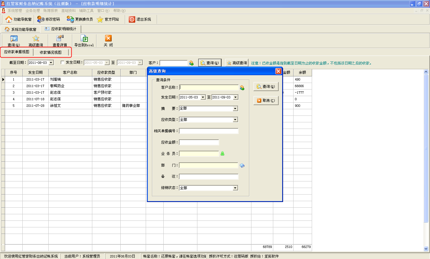 2、應收款管理和應付款管理增加部門列和高級查詢功能。