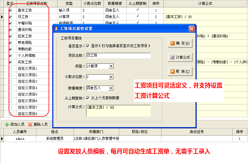 2、工資項目支持定義公式,可計算工資項,并可設置保留精度。