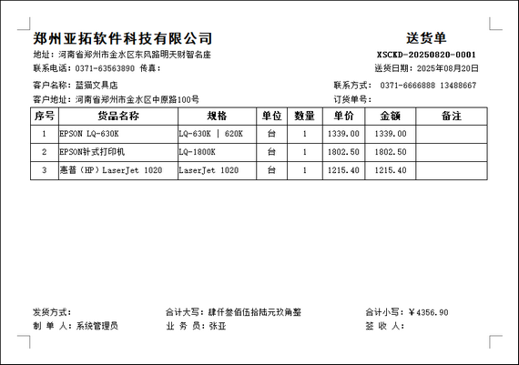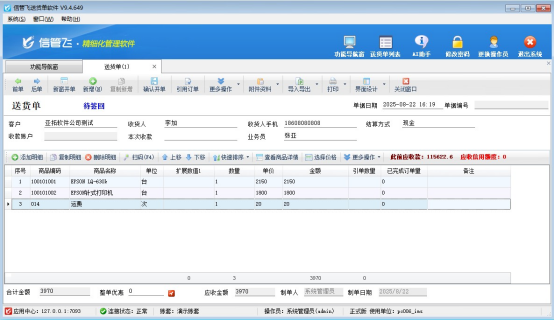 客戶業(yè)務(wù)中包含搬工費、跑腿費、運費等費用,使用信管飛軟件該如何在銷售單上顯示這些費用,并且同時計入到客戶應(yīng)收款里面,本文以信管飛送貨單軟件介紹服務(wù)費該如何計入客戶應(yīng)收款? 在功能導(dǎo)航欄“基礎(chǔ)資料”----“商品信息”模塊下新增商品性質(zhì)“服務(wù)及費用”的商品,商品名稱命名為“運費”,如下圖所示,搬工費和跑腿費操作方式一樣。 新開送貨單,添加商品明細(xì)中包含運費項:(EPSON LQ-630k)2150元+(EPSON針式打印機)1800元+(運費)20元=