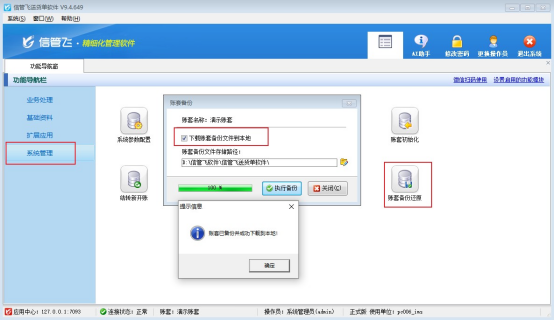 信管飛軟件旗下所有產(chǎn)品均支持云賬套模式,數(shù)據(jù)存儲于云端,用戶在本地連接網(wǎng)絡(luò)時,通過賬號密碼即可直接訪問數(shù)據(jù)。系統(tǒng)默認(rèn)每天自動在云端備份數(shù)據(jù),若需將備份數(shù)據(jù)存儲到本地,可按以下步驟下載: 演示視頻:如何解決云賬套備份下載至本地?zé)o法直接還原問題? 在功能導(dǎo)航窗點擊 “系統(tǒng)管理”,打開賬套備份還原界面,點擊 “執(zhí)行備份”,選擇目標(biāo)備份文件后下載即可(操作界面如下圖所示)。 部分用戶反饋,下載后的備份文件無法直