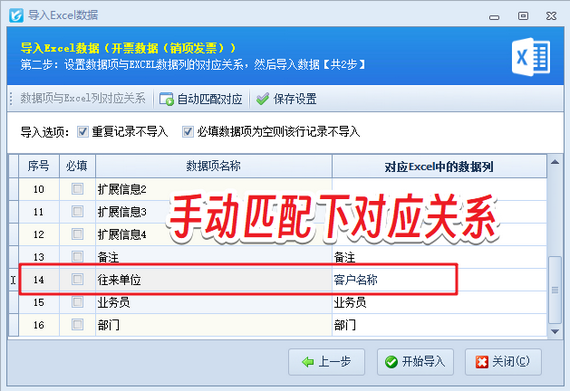 在企業(yè)的采購與銷售流程中,發(fā)票管理至關(guān)重要。信管飛出納記賬軟件憑借其強大的發(fā)票管理功能,助力企業(yè)高效、精準(zhǔn)地處理發(fā)票信息。另外,軟件支持導(dǎo)入Excel快速導(dǎo)入發(fā)票信息。有用戶在軟件內(nèi)導(dǎo)出銷項發(fā)票Excel模版,維護數(shù)據(jù)后導(dǎo)入軟件,客戶名稱這一項導(dǎo)入不成功,如下圖所示。 出現(xiàn)以上問題的原因是:表格內(nèi)“客戶名稱”和軟件內(nèi)“往來單位”名稱不一致,自動匹配對應(yīng)關(guān)系時,無法自動匹配上。 需要手動匹配一下軟件內(nèi)數(shù)據(jù)項與Excel數(shù)據(jù)列的對應(yīng)關(guān)系,對應(yīng)關(guān)系設(shè)置完成后,重新導(dǎo)入,即可導(dǎo)入成功。&nbs