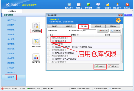在使用信管飛軟件進行新增倉庫時,是否遇到過這樣的困擾:操作員在倉庫信息界面新增了倉庫,卻發(fā)現(xiàn)新增的倉庫信息如同“石沉大海”,根本無法顯示,這嚴(yán)重影響了工作效率,出現(xiàn)這種問題的主要原因在于該操作員賬號沒有分配到倉庫權(quán)限導(dǎo)致的,本篇文章介紹下如何解決? 首先,切換系統(tǒng)管理員登錄,功能導(dǎo)航窗點擊“系統(tǒng)管理”—》“系統(tǒng)參數(shù)配置”—》“業(yè)務(wù)參數(shù)”進入業(yè)務(wù)參數(shù)配置界面,在系統(tǒng)安全及權(quán)限參數(shù)中勾選“啟用倉庫權(quán)限”參數(shù),如圖: 之后點擊“系統(tǒng)管理”—》“操作員及授權(quán)