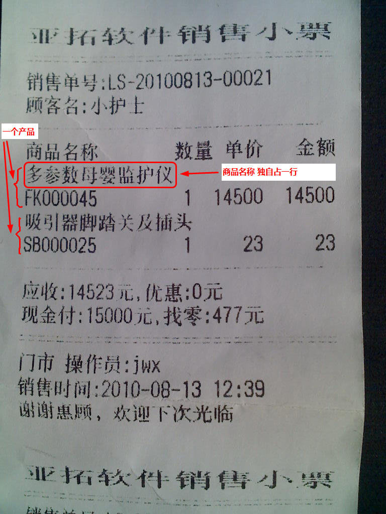 有關商品名稱截斷的問題,如果不復選“商品名稱截斷”,則系統打印出的效果為下圖所示,商品名稱單獨占一行,一個商品總共占兩行。