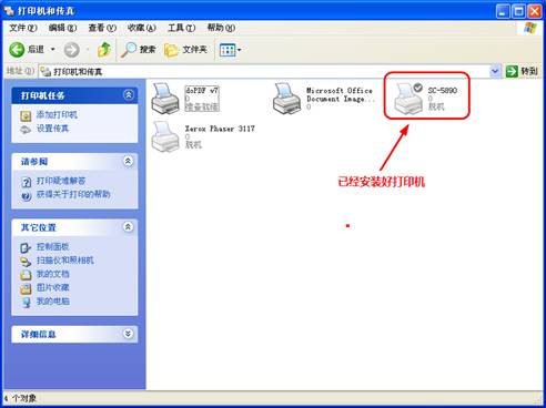 (3)、安裝好驅動程序后,在“控制面板”的“打印機和傳真”中,會多出來一個名為“SC-5890”的打印機,如下圖所示: