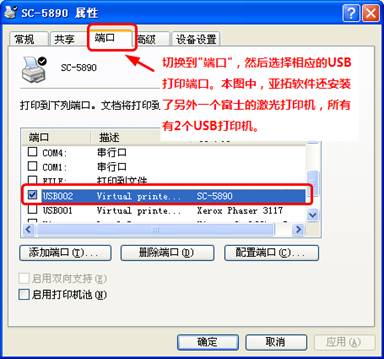 在彈出的屬性窗口,點擊“端口”標簽頁,選擇相應的USB打印端口,如下圖,我們選擇USB002打勾,這是一個虛擬打印USB端口(Virtual Printer Port For USB),一般大家的機器如果只有一個USB口的打印機,則選擇USB001即可。
