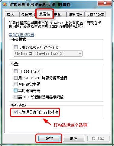 (2)系統(tǒng)會(huì)彈出屬性窗口,請(qǐng)?jiān)凇凹嫒菪浴睒?biāo)簽頁中選中“以管理員身份運(yùn)行此程序”復(fù)選框,然后點(diǎn)擊“確定”按鈕。