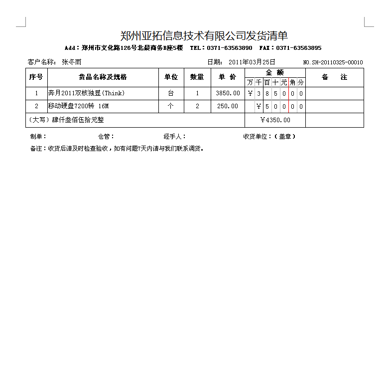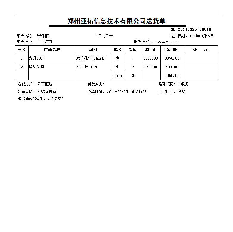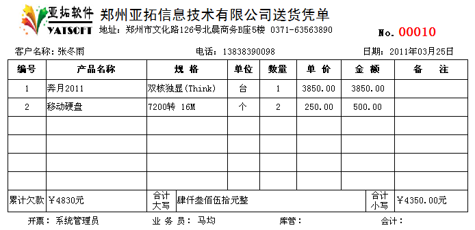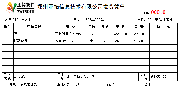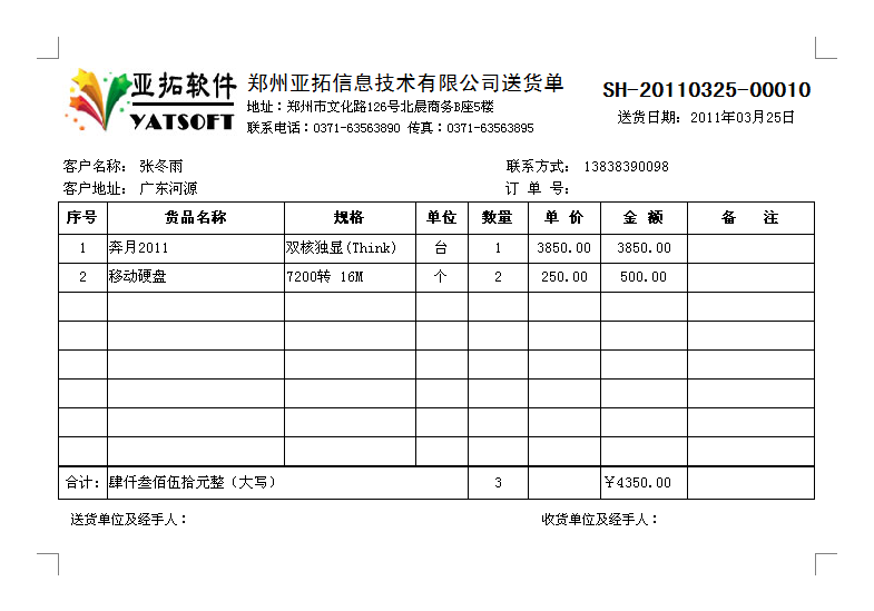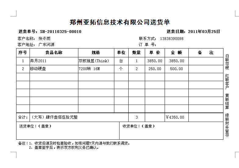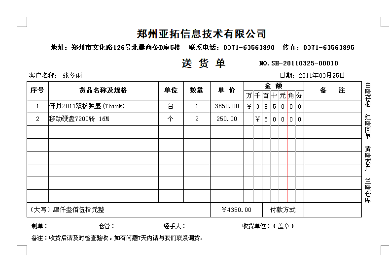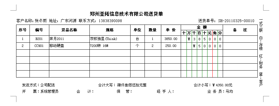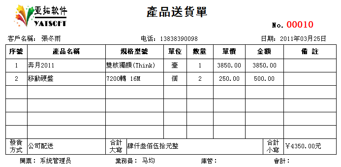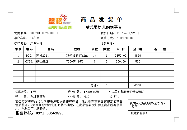 2011年12月31日前購(gòu)買正版送貨單軟件,我們可免費(fèi)定制送貨單樣式一套,以后如果新設(shè)計(jì)打印格式模板每個(gè)50元。系統(tǒng)內(nèi)置了一些送貨單打印格式供參考,可在現(xiàn)有模版的基礎(chǔ)上進(jìn)行定制,也可以將送貨單格式進(jìn)行掃描發(fā)送給我們,由我們進(jìn)行定制。