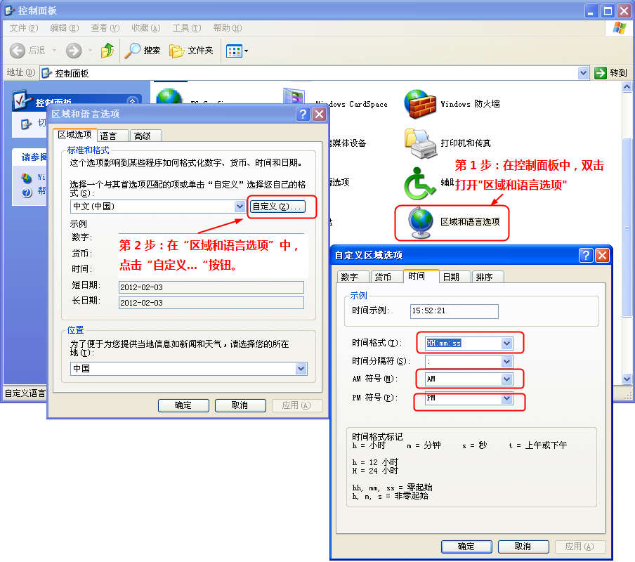 在控制面板中,找到“區域和語言選項”并打開,如下圖所示設置時間和日期格式: