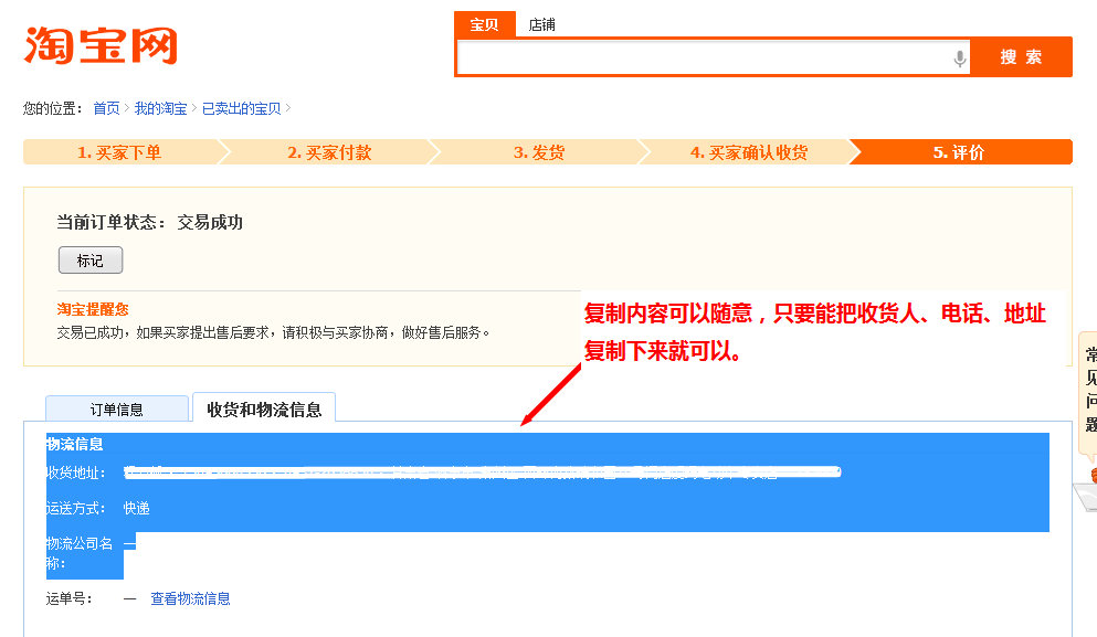 首先,打開淘寶訂單詳情頁,然后在“收貨和物流信息”中復制“圖示部分”的內容: