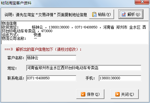 然后,在送貨單或訂單開單窗口,點“更多操作”->"粘貼淘寶客戶資料",在彈出的窗口中是不是客戶信息已經解析出來了?如果需要復制其他客戶資料,重復上面的步驟,點“粘貼”,然后點“解析”按鈕即可。