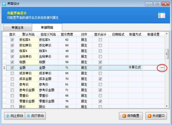 界面設計中也可以通過將數據項向上、向下移動來調整顯示的先后順序,以及可以通過調整顯示寬度的數值來調整數據項在單據中的顯示寬度,也可以改變數據項的對齊方式等。