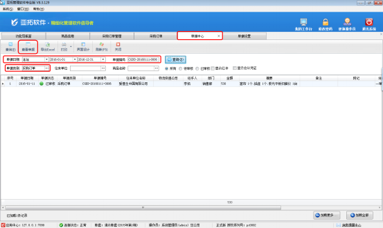 情況二:具體的單據(jù)編號不清楚,但是知道單據(jù)類別及此單中存在某種商品或者是往來單位信息,可以在單據(jù)中心中選擇單據(jù)日期,并選擇相應的查詢內(nèi)容進行查詢,如需要查詢本年內(nèi)包含某商品的采購訂單,單據(jù)日期可以選擇本年,然后選擇相應單據(jù)類別及商品名稱進行查詢即可查詢出所查詢的時間段內(nèi)包含此商品的所有訂單,然后可以在所查詢的內(nèi)容中選擇所需要的訂單,如下圖三所示。