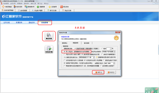 打開“系統(tǒng)管理”—“賬套參數(shù)”—“賬套參數(shù)”,將選項(xiàng)“錄入憑證時(shí),啟用輔助科目(如手續(xù)費(fèi)等)”打勾啟用輔助科目并保存,如下圖所示。