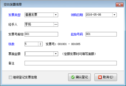 新增記錄:點(diǎn)擊“新增記錄”按鈕,進(jìn)入“空白發(fā)票信息”窗口,如圖2所示,其中“起始號(hào)碼”是必填項(xiàng),其他內(nèi)容根據(jù)自己的業(yè)務(wù)需要進(jìn)行填寫,最后點(diǎn)擊“確認(rèn)登記”即可。