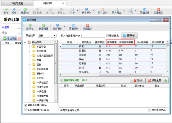 參數設置好后,在開單選擇商品明細時就可以查看到商品的庫存數量,以及可用庫存量。以采購訂單為例,選擇商品明細時,商品界面顯示設置的參數,如圖2所示: