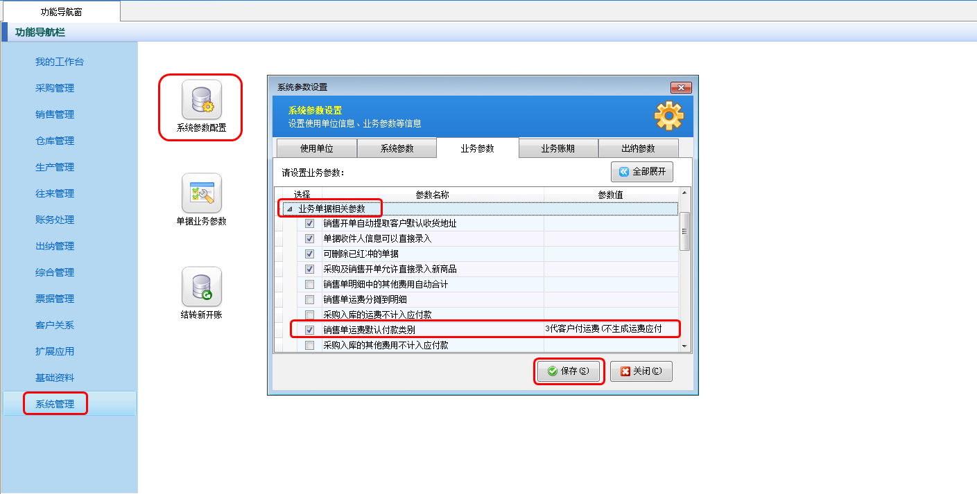在功能導航窗點擊“系統管理”—》“系統參數配置”—》“業務參數”,即可進入到“業務參數”界面,在業務單據相關參數內可以設置參數“銷售單運費默認付款類別”的參數值,此處設置為“3代客戶付運費(不生成運費應付款,運費計入應收金額)”,設置完點擊“保存”按鈕保存配置,如下圖一所示。