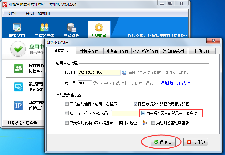 在亞拓管理軟件應用中心內點擊“系統參數”—》“基本參數”打開“基本參數”設置界面,在“基本參數”設置界面打勾啟用“同一操作員只能登錄一個客戶端”,然后點擊“保存”按鈕保存設置,如下圖一所示。