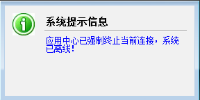 設置完之后再次登錄系統時,如果當前登錄的操作員已經登錄了系統,則應用中心會強制斷開之前的連接,在系統右下角會彈出POP窗提示“應用中心已強制終止當前連接,系統已離線!”,如下圖二所示。