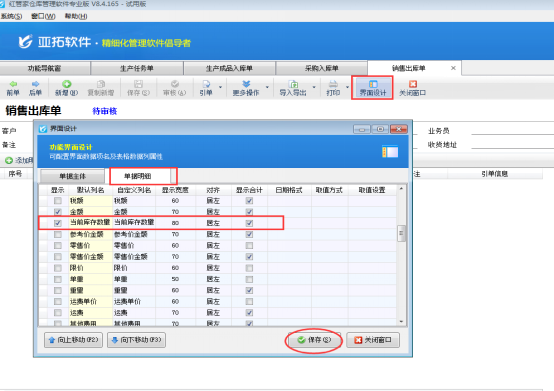 打開軟件的“銷售管理”模塊,新開一個銷售出庫單,點擊“界面設計”選擇“單據明細”數據項,找到“當前庫存數量”數據項并勾選上,保存界面設計。具體如圖1所示:
