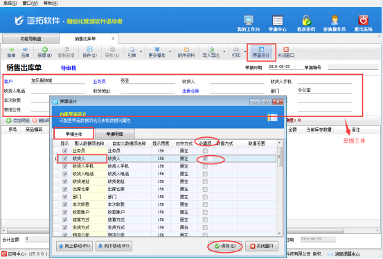 為了避免在開單的時候漏掉必須要填寫的信息,亞拓管理軟件、紅管家倉庫管理軟件、紅管家送貨單軟件等支持設(shè)計單據(jù)主體必填項(xiàng)。下邊以亞拓管理軟件專業(yè)版“銷售出庫單”開單為例,設(shè)置單據(jù)主體必填項(xiàng)。