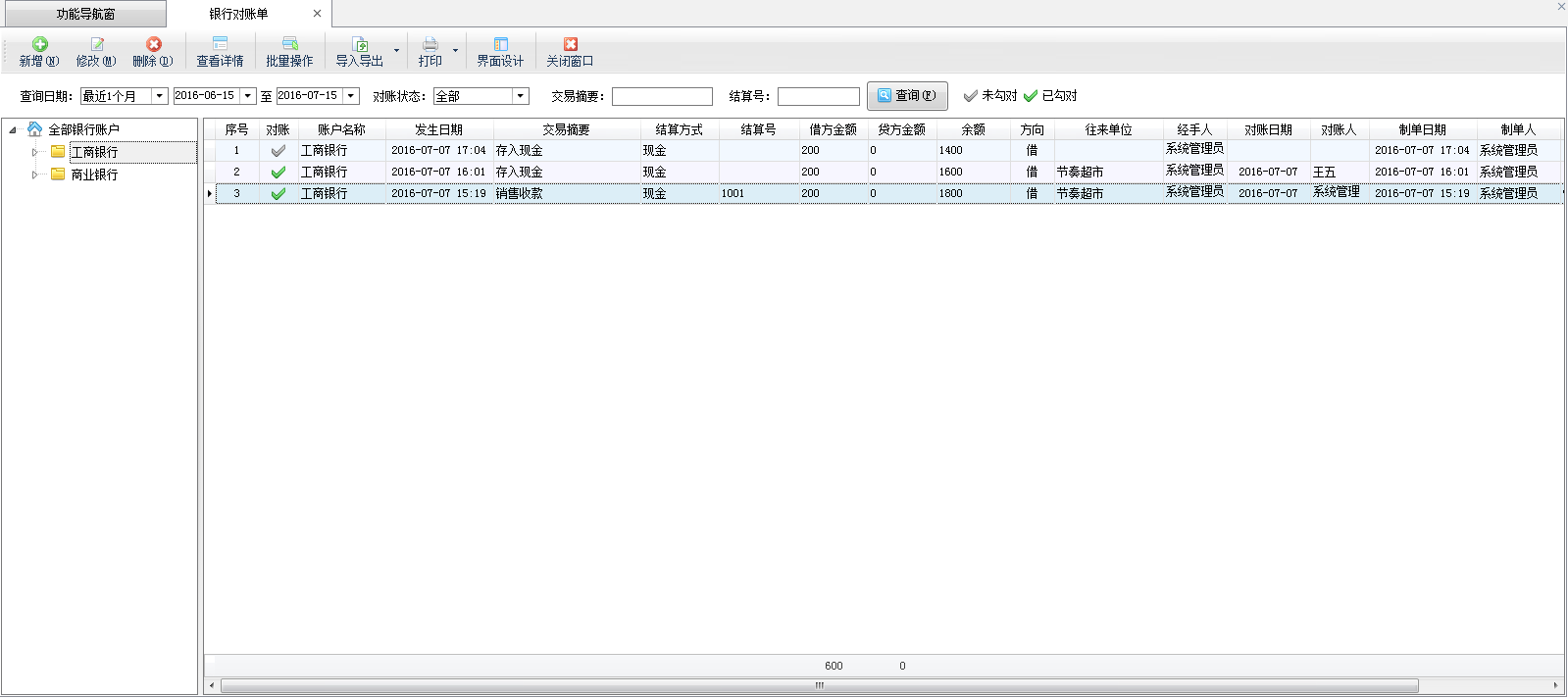 查詢銀行對賬記錄:選擇查詢日期、銀行賬戶、交易摘要及結算號等條件后,點擊工具欄的“查詢”按鈕即可查詢銀行對賬記錄。