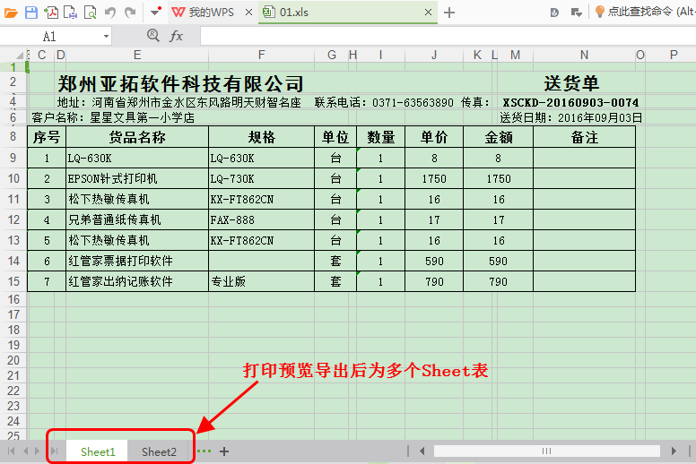 亞拓管理軟件紅管家倉庫管理軟件紅管家送貨單軟件紅管家出納記賬軟件等軟件內都提供的有打印預覽及打印功能,可以打印送貨單銷售明細對賬單及各類報表,多數用戶會將銷售單或者是銷售明細對賬單的打印預覽效果導出為Excel文件直接發給客戶與客戶進行對賬,但是多頁時將打印預覽效果直接導出后是多個Sheet表,如下圖二所示,本篇文章以紅管家送貨單軟件為例詳細介紹下打印預覽導出為Excel后為多個Sheet表的情況該如何解決?