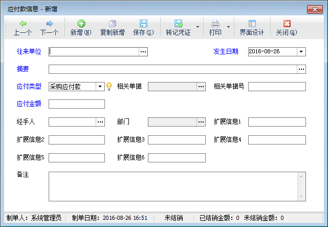 應(yīng)付類型:應(yīng)付類型包括采購應(yīng)付款、采購預(yù)付款、采購?fù)素洃?yīng)退款、期初應(yīng)付款、其他應(yīng)付款,應(yīng)付類型有特殊含義無法維護(hù),如果需要標(biāo)注其他應(yīng)付類型可以填寫到擴(kuò)展信息中。