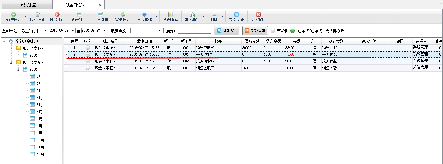 設(shè)置完成之后,我們在功能導(dǎo)航窗點(diǎn)擊“出納管理”——》“現(xiàn)金日記賬”打開現(xiàn)金日記賬界面,對現(xiàn)金賬戶“現(xiàn)金(李亞)”、“現(xiàn)金(李拓)”分別再新增兩條日記賬記錄來查看下憑證號,可以看到所有的資金賬戶憑證號為依次遞增,而不再是每個(gè)資金賬戶根據(jù)當(dāng)前賬戶的憑證號進(jìn)行依次遞增,如下圖三中所示。