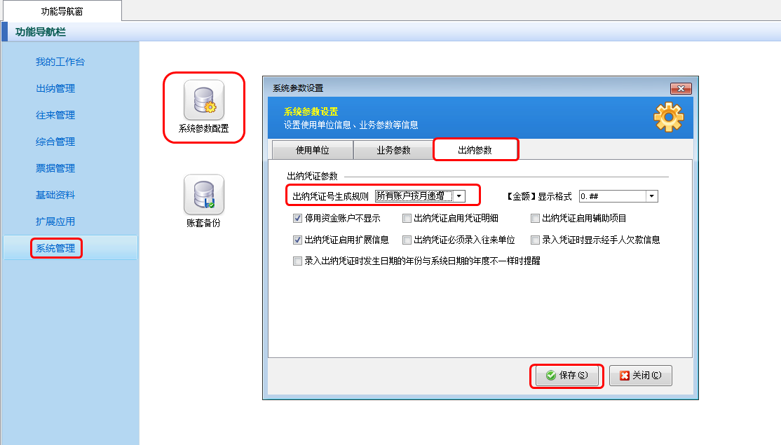 在功能導(dǎo)航窗點(diǎn)擊“系統(tǒng)管理”——》“系統(tǒng)參數(shù)配置”——》“出納參數(shù)”可以進(jìn)入到“出納參數(shù)”設(shè)置界面,在此界面可以設(shè)置憑證號生成規(guī)則,如下圖二所示,此處設(shè)置為“所有賬戶按月遞增”。